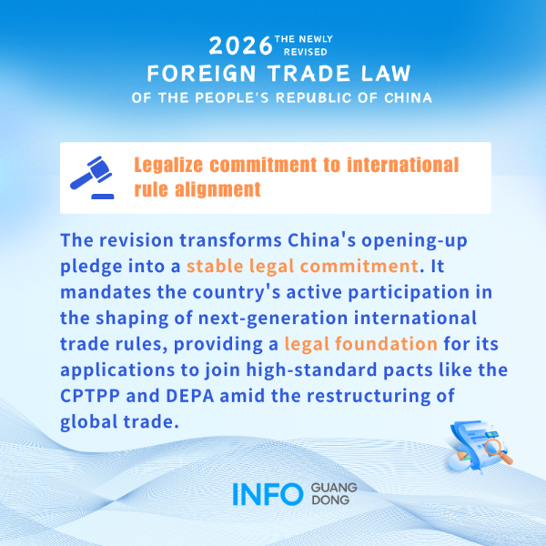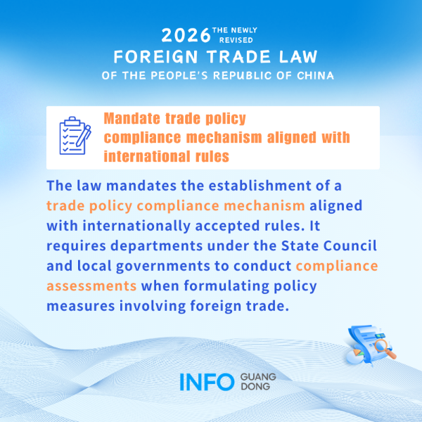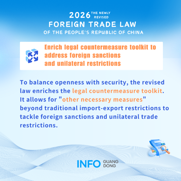 China's newly revised Foreign Trade Law took effect on March 1, 2026, marking the second overhaul of the foundational law governing its foreign trade. Here are some highlights of the newly revised Foreign Trade Law: