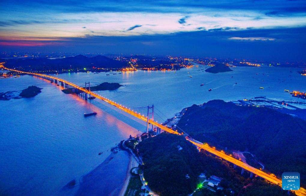 An aerial drone photo taken on June 23, 2020 shows a view of the Humen Bridge, which links Guangzhou city and Dongguan city, in South China's Guangdong province.