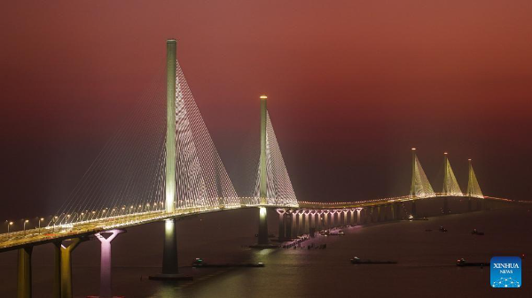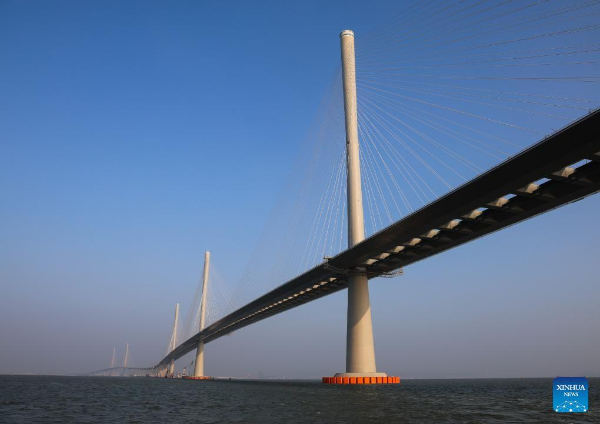 This photo taken on December 7, 2024 shows a view of Gaolan Port Bridge (with twin main towers on the left) and Huangmao Sea Channel Bridge (with three main towers on the right) in South China's Guangdong province.