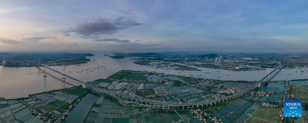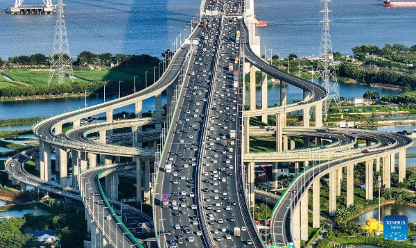 An aerial drone photo taken on October 2, 2024 shows a view of an interchange overpass on the Nansha Bridge, which links Guangzhou city and Dongguan city, in Haiou Island of the Pearl River Estuary area in Guangzhou, South China's Guangdong province.
