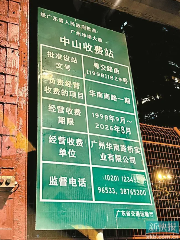 Signs at toll stations have been updated to show the operating period ending in August 2026. The city's 12345 hotline confirmed this. The adjacent Panyu Bridge will continue charging until its toll period ends in 2027.