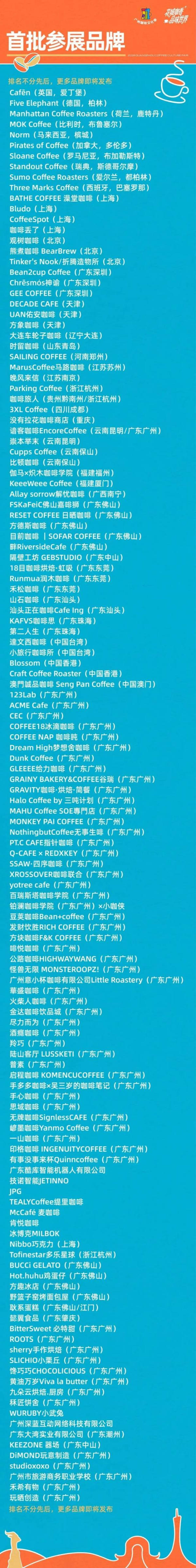 Domestically, alongside the host city Guangzhou, the roster features brands from Shanghai, Beijing, Shenzhen, Tianjin, Dalian, Qingdao, Zhengzhou, Suzhou, Nanjing, Hangzhou, Qiannan Buyi and Miao Autonomous Prefecture, Chengdu, Chongqing, Kunming, Baoshan, Fuzhou, Xiamen, Nanning, Foshan, Jiangmen, Zhongshan, Dongguan, Chaozhou, Shantou, Zhaoqing, Zhuhai, as well as Hong Kong, Macao, and Taiwan.