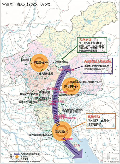 “三極”,即以南沙新區(qū)、東部中心、北部增長(zhǎng)極為先進(jìn)制造業(yè)基地重要承載區(qū),集聚創(chuàng)新型企業(yè)、創(chuàng)新型技術(shù)、創(chuàng)新型人才,增強(qiáng)產(chǎn)業(yè)鏈韌性,輻射帶動(dòng)各區(qū)制造業(yè)向高端化、智能化、綠色化發(fā)展。