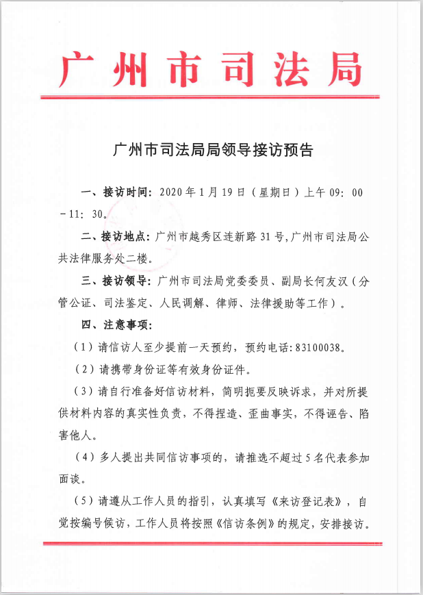 廣州市司法局局領(lǐng)導(dǎo)接訪預(yù)告(2020年1月)