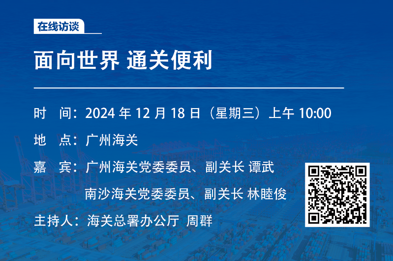 廣州海關(guān)將于12月18日(星期三)上午10:00-12:00在中國(guó)海關(guān)門(mén)戶(hù)網(wǎng)站舉行題為“面向世界 通關(guān)便利”的在線訪談。屆時(shí),廣州海關(guān)及其所屬南沙海關(guān)相關(guān)人員將參與“在線訪談”并在線回答網(wǎng)友提問(wèn)。