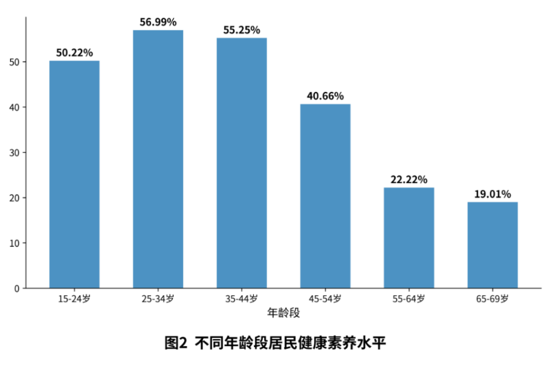 監(jiān)測(cè)數(shù)據(jù)顯示,15-34歲年齡段居民健康素養(yǎng)水平呈上升趨勢(shì),25-34歲年齡段最高,為56.99%;35歲以上,隨著年齡的增長(zhǎng),居民健康素養(yǎng)水平逐漸下降,65-69歲年齡段居民健康素養(yǎng)水平最低,為19.01%。