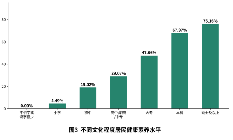 居民健康素養(yǎng)水平與文化程度有較大的關(guān)系,本次調(diào)查中,不識(shí)字或識(shí)字少居民健康素養(yǎng)水平最低,為0;碩士及以上居民健康素養(yǎng)水平最高,為76.16%。