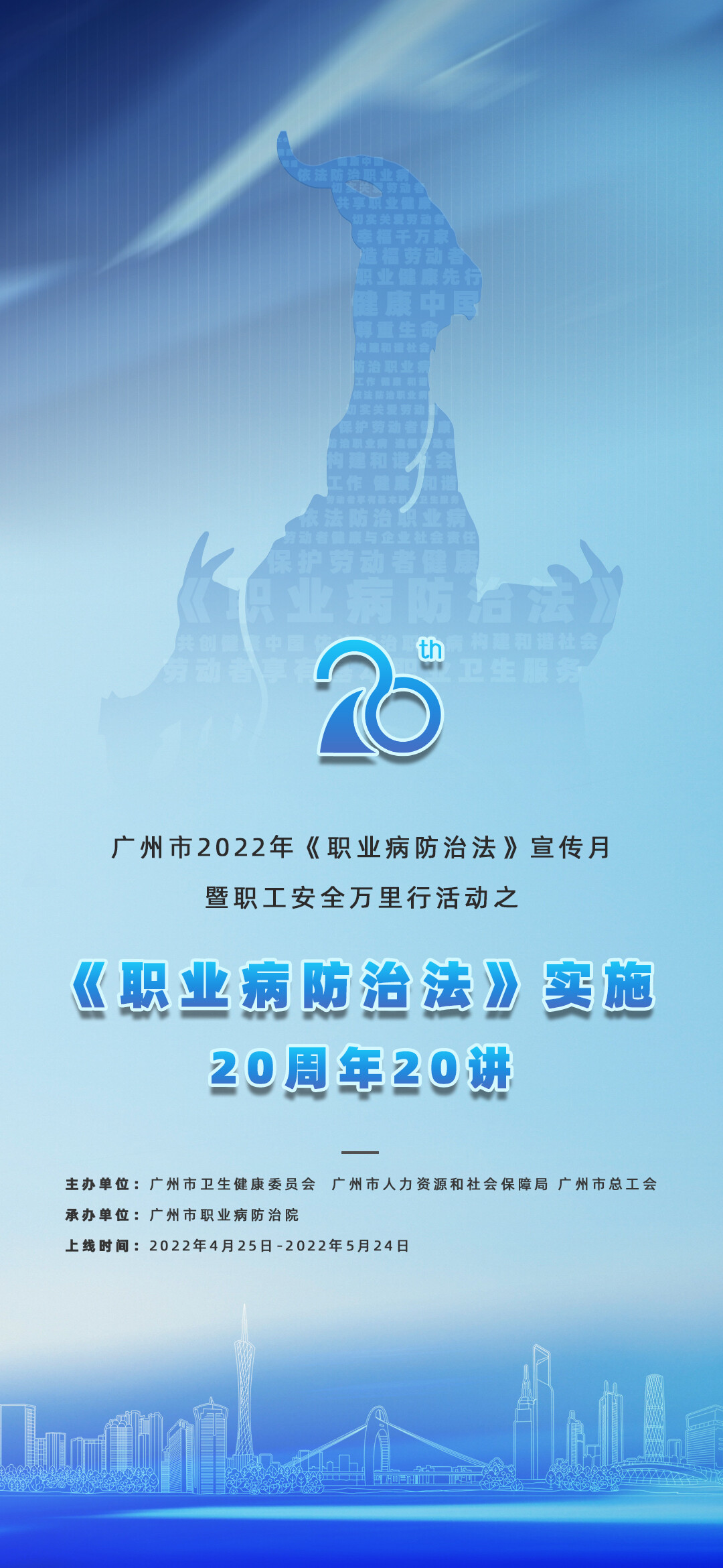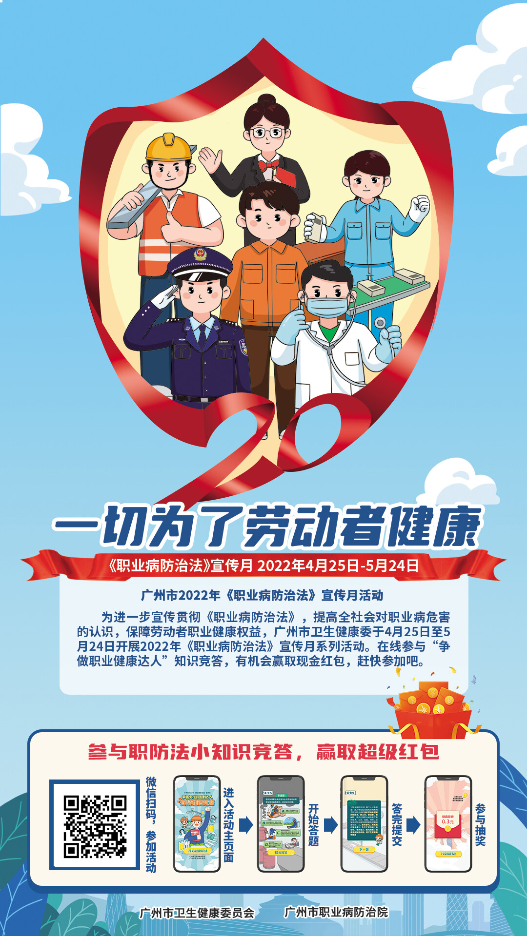 2002年5月1日,《中華人民共和國(guó)職業(yè)病防治法》正式頒布實(shí)施,每年“五一”勞動(dòng)節(jié)前的最后一周,是全國(guó)《職業(yè)病防治法》宣傳周,今年是我國(guó)《職業(yè)病防治法》實(shí)施第20周年,主題為“一切為了勞動(dòng)者健康”,廣州市衛(wèi)健委、廣州市民政局、廣州市人社局、廣州市醫(yī)保局、廣州市總工會(huì)聯(lián)合開(kāi)展廣州市2022年《職業(yè)病防治法》宣傳月暨職工安全健康萬(wàn)里行活動(dòng),在此期間將開(kāi)展專(zhuān)家宣講、作品征集、有獎(jiǎng)知識(shí)競(jìng)答等系列活動(dòng),文末更有精美職業(yè)健康宣傳材料可以免費(fèi)獲?。?/span>