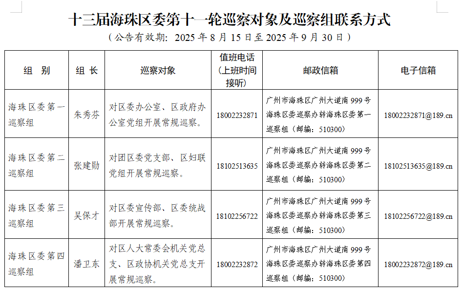 本輪巡察從2025年8月15日開始,2025年9月30日完成現(xiàn)場巡察工作。巡察組受理信訪時(shí)間截至2025年9月30日。海珠區(qū)委巡察辦公布了各巡察組的組長名單以及在巡察期間設(shè)置的值班電話、郵政信箱和電子信箱。