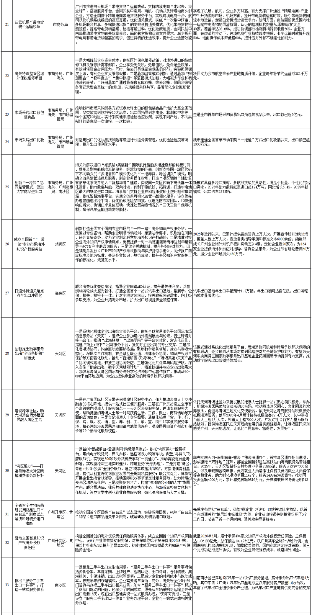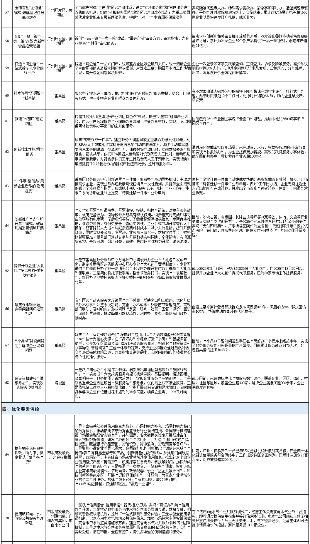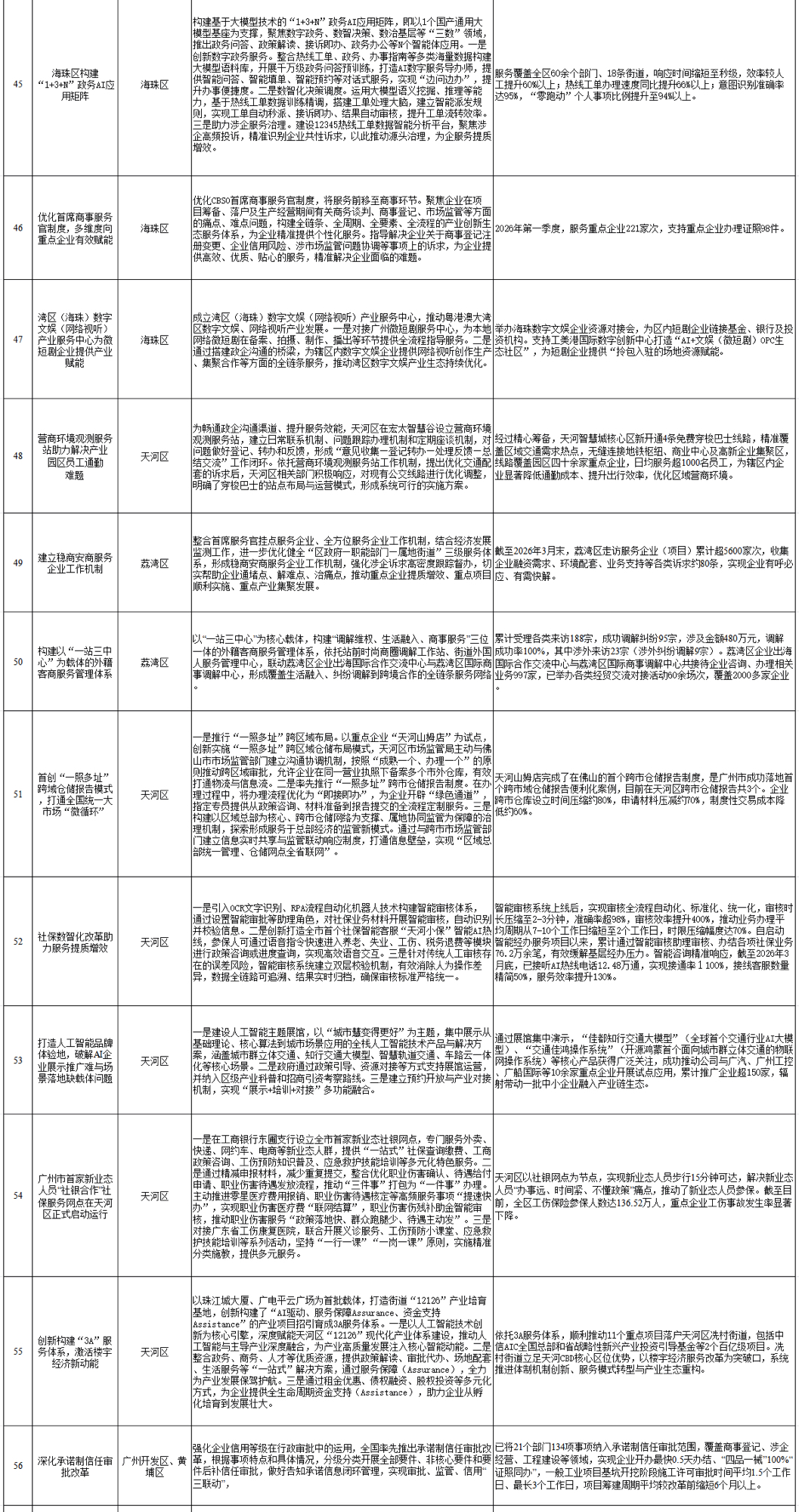 一是著力降本增效,推出17項(xiàng)降低制度性交易成本典型案例。比如優(yōu)化汽車、生鮮、馬匹等通關(guān)流程,降低企業(yè)進(jìn)出口貿(mào)易成本。創(chuàng)新“動(dòng)態(tài)倉(cāng)”監(jiān)管,降低企業(yè)資金占用成本。推進(jìn)拿地即開(kāi)工、“五證聯(lián)發(fā)”,降低項(xiàng)目用地等待成本等。二是深化開(kāi)放創(chuàng)新。推出17項(xiàng)擴(kuò)大制度型對(duì)外開(kāi)放典型案例。比如全國(guó)首創(chuàng)白云機(jī)場(chǎng)跨境電商“帶電貨物”服務(wù)平臺(tái),助力跨境貿(mào)易跑出“加速度”。落地首個(gè)海關(guān)特殊監(jiān)管區(qū)域外飛機(jī)保稅維修項(xiàng)目,為開(kāi)放型經(jīng)濟(jì)發(fā)展注入新動(dòng)能。成立全國(guó)首個(gè)“一帶一路”專業(yè)市場(chǎng)海外知識(shí)產(chǎn)權(quán)服務(wù)站,助力企業(yè)揚(yáng)帆出海等。三是突出數(shù)字賦能,推出34項(xiàng)提升政務(wù)服務(wù)效能典型案例。比如創(chuàng)新“人工智能+檔案”一體化服務(wù)模式,在人力資源檔案服務(wù)領(lǐng)域構(gòu)建自動(dòng)化綜合服務(wù)生態(tài)。依托營(yíng)商環(huán)境觀測(cè)服務(wù)站,推動(dòng)個(gè)性化政務(wù)服務(wù)觸及產(chǎn)業(yè)園區(qū)一線。首創(chuàng)“企速通”模式,為重點(diǎn)項(xiàng)目和企業(yè)提供“一對(duì)一”全生命周期專屬保障服務(wù)等。四是聚焦核心要素,推出21項(xiàng)優(yōu)化要素供給典型案例。比如創(chuàng)新推出招商土地超市公眾版,直觀展示全市土地資源,實(shí)現(xiàn)企業(yè)“掌上選地、一站式競(jìng)買”。依托“信易貸”平臺(tái)提升融資信用服務(wù)質(zhì)效,助力中小微企業(yè)以“信”換“貸”。打造琶洲模方人工智能孵化基地,成為人工智能產(chǎn)業(yè)孵化的標(biāo)桿平臺(tái)等。五是增強(qiáng)企業(yè)信心,推出11項(xiàng)保護(hù)市場(chǎng)主體合法權(quán)益典型案例。比如上線“廣州市經(jīng)營(yíng)者公平競(jìng)爭(zhēng)管理公共服務(wù)平臺(tái)”,提供全景化、公益性競(jìng)爭(zhēng)合規(guī)法律服務(wù)。設(shè)立廣州體育商事仲裁院及全運(yùn)會(huì)商事(知識(shí)產(chǎn)權(quán))仲裁庭,健全體育商事糾紛多元解紛機(jī)制,為體育產(chǎn)業(yè)高質(zhì)量發(fā)展保駕護(hù)航。構(gòu)建知識(shí)產(chǎn)權(quán)異地維權(quán)援助體系,助力中小企業(yè)異地高效維權(quán)等。
