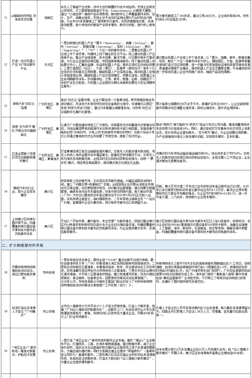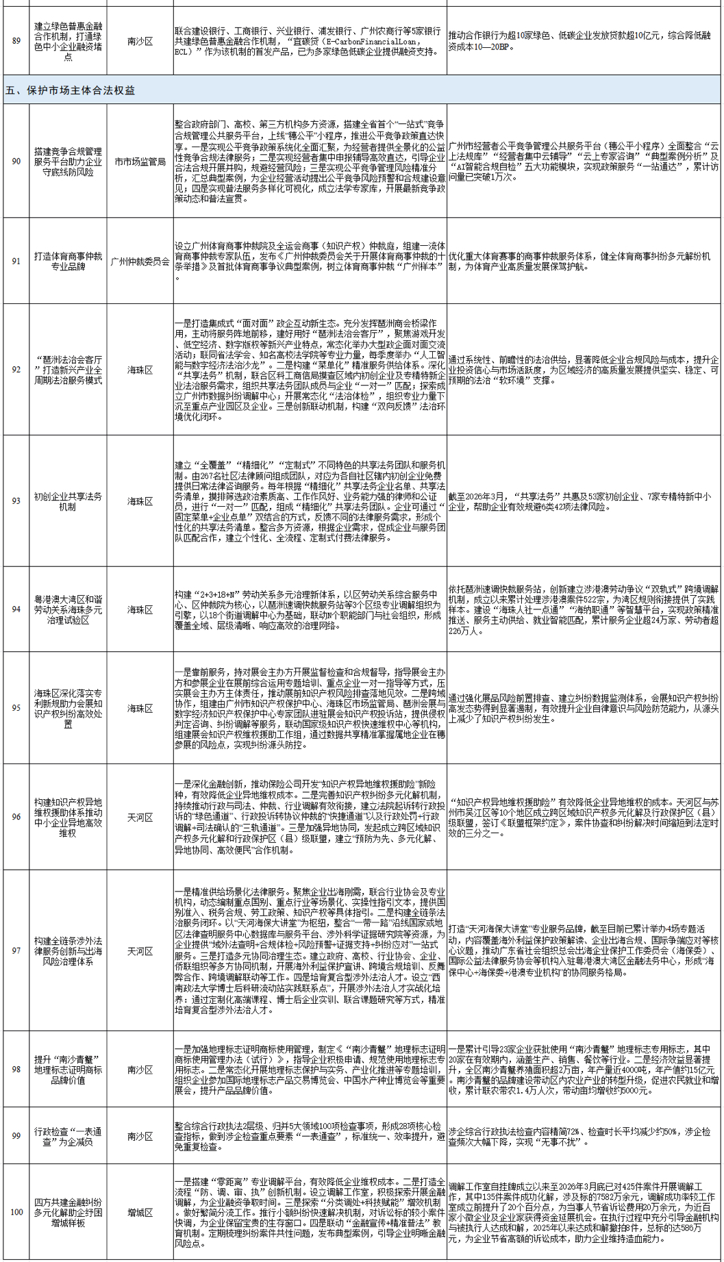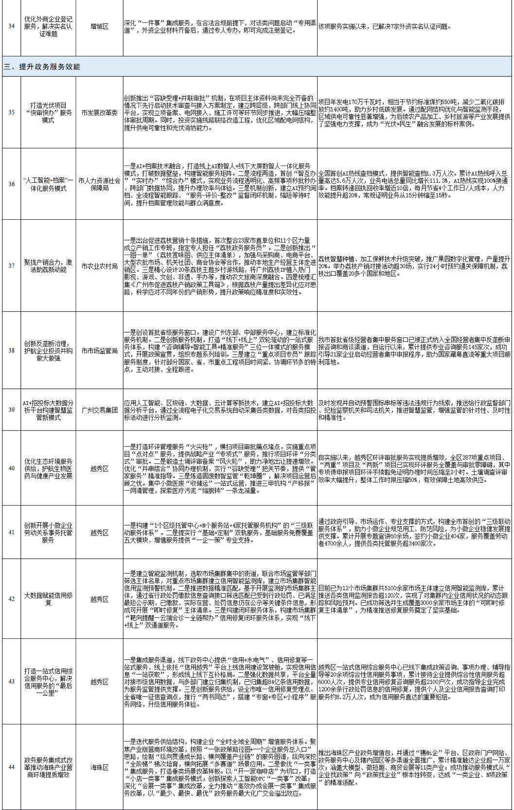 一是著力降本增效,推出17項(xiàng)降低制度性交易成本典型案例。比如優(yōu)化汽車、生鮮、馬匹等通關(guān)流程,降低企業(yè)進(jìn)出口貿(mào)易成本。創(chuàng)新“動(dòng)態(tài)倉(cāng)”監(jiān)管,降低企業(yè)資金占用成本。推進(jìn)拿地即開(kāi)工、“五證聯(lián)發(fā)”,降低項(xiàng)目用地等待成本等。二是深化開(kāi)放創(chuàng)新。推出17項(xiàng)擴(kuò)大制度型對(duì)外開(kāi)放典型案例。比如全國(guó)首創(chuàng)白云機(jī)場(chǎng)跨境電商“帶電貨物”服務(wù)平臺(tái),助力跨境貿(mào)易跑出“加速度”。落地首個(gè)海關(guān)特殊監(jiān)管區(qū)域外飛機(jī)保稅維修項(xiàng)目,為開(kāi)放型經(jīng)濟(jì)發(fā)展注入新動(dòng)能。成立全國(guó)首個(gè)“一帶一路”專業(yè)市場(chǎng)海外知識(shí)產(chǎn)權(quán)服務(wù)站,助力企業(yè)揚(yáng)帆出海等。三是突出數(shù)字賦能,推出34項(xiàng)提升政務(wù)服務(wù)效能典型案例。比如創(chuàng)新“人工智能+檔案”一體化服務(wù)模式,在人力資源檔案服務(wù)領(lǐng)域構(gòu)建自動(dòng)化綜合服務(wù)生態(tài)。依托營(yíng)商環(huán)境觀測(cè)服務(wù)站,推動(dòng)個(gè)性化政務(wù)服務(wù)觸及產(chǎn)業(yè)園區(qū)一線。首創(chuàng)“企速通”模式,為重點(diǎn)項(xiàng)目和企業(yè)提供“一對(duì)一”全生命周期專屬保障服務(wù)等。四是聚焦核心要素,推出21項(xiàng)優(yōu)化要素供給典型案例。比如創(chuàng)新推出招商土地超市公眾版,直觀展示全市土地資源,實(shí)現(xiàn)企業(yè)“掌上選地、一站式競(jìng)買”。依托“信易貸”平臺(tái)提升融資信用服務(wù)質(zhì)效,助力中小微企業(yè)以“信”換“貸”。打造琶洲模方人工智能孵化基地,成為人工智能產(chǎn)業(yè)孵化的標(biāo)桿平臺(tái)等。五是增強(qiáng)企業(yè)信心,推出11項(xiàng)保護(hù)市場(chǎng)主體合法權(quán)益典型案例。比如上線“廣州市經(jīng)營(yíng)者公平競(jìng)爭(zhēng)管理公共服務(wù)平臺(tái)”,提供全景化、公益性競(jìng)爭(zhēng)合規(guī)法律服務(wù)。設(shè)立廣州體育商事仲裁院及全運(yùn)會(huì)商事(知識(shí)產(chǎn)權(quán))仲裁庭,健全體育商事糾紛多元解紛機(jī)制,為體育產(chǎn)業(yè)高質(zhì)量發(fā)展保駕護(hù)航。構(gòu)建知識(shí)產(chǎn)權(quán)異地維權(quán)援助體系,助力中小企業(yè)異地高效維權(quán)等。