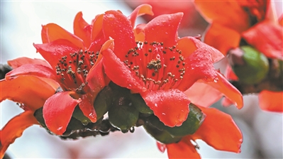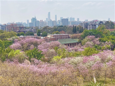 海珠國家濕地公園里,宮粉紫荊與櫻花相繼綻放,粉白花海在水岸之間延伸;華南農(nóng)業(yè)大學紫荊大道上,花枝如云,微風拂過,花瓣輕輕飄落,鋪成一條淡紫色的花路;中山紀念堂前,古木棉年年如約盛開,紅花高舉,與古建筑相映生輝。流花湖畔、二沙島邊、閱江路沿線,三角梅、紫荊、木棉次第開放,讓整座城市仿佛生長在花海之中。