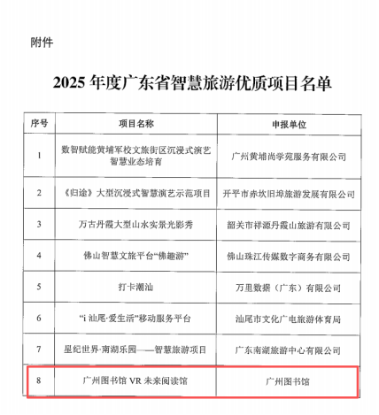 為深入貫徹全省旅游發(fā)展大會(huì)精神,落實(shí)《關(guān)于推動(dòng)旅游業(yè)高質(zhì)量發(fā)展加快建設(shè)旅游強(qiáng)省的若干措施》工作任務(wù),推動(dòng)《智慧旅游創(chuàng)新發(fā)展行動(dòng)計(jì)劃》落地見(jiàn)效,加快推進(jìn)我省智慧旅游創(chuàng)新發(fā)展,廣東省文化和旅游廳在全省范圍內(nèi)組織開(kāi)展了2025年度全省智慧旅游優(yōu)質(zhì)項(xiàng)目遴選工作。經(jīng)嚴(yán)格評(píng)審,廣州圖書(shū)館“VR未來(lái)閱讀館”從眾多參評(píng)項(xiàng)目中脫穎而出,榮膺該項(xiàng)殊榮。