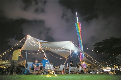 在二沙島藝術(shù)公園,不少市民游客選擇在夜晚時段前來露營,近距離欣賞廣州塔美景