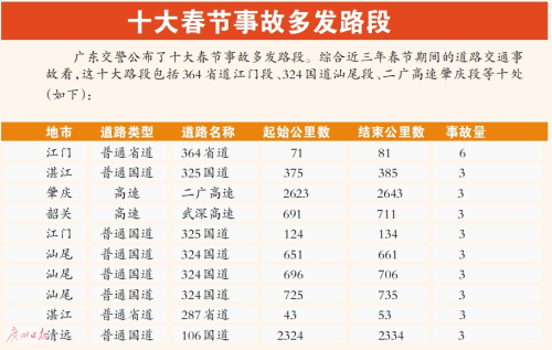 根據(jù)預(yù)測(cè),自年初二(1月26日)起,廣東入省口車流量增大,到年初六(1月30日)將迎來(lái)最高峰。春節(jié)后的首個(gè)周日即年初九(2月2日)也將有一波返程高峰。預(yù)計(jì)返程高峰易發(fā)生擁堵的路段主要有:清連高速六甲洞隧道至杉崗大橋段、焦沖收費(fèi)站至六甲洞隧道段,沈海高速白沙收費(fèi)站段、馬踏收費(fèi)站段,深岑高速新興收費(fèi)站至埝村收費(fèi)站段,廣昆高速肇慶白土收費(fèi)站至蜆崗服務(wù)區(qū)段,廣梧高速羅日免隧道至回龍收費(fèi)站段,二廣高速貓兒嶺隧道至南木嶺隧道段,京港澳高速小塘服務(wù)區(qū)至小塘大橋段,武深高速榕樹隧道段。