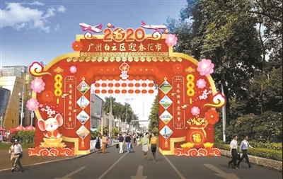白云花市牌樓設(shè)計以中國傳統(tǒng)的大紅燈籠為主題造型,配以小燈籠、桃花、飛機進行點綴,加上白云山、云臺花園等白云區(qū)知名景點以及寓意招財納福、福祿雙全的招財鼠和大福袋,呈現(xiàn)國泰民安、喜慶團圓、一派祥和的景象。