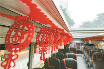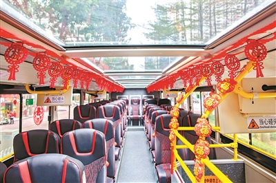 雙層巴士內(nèi)部掛滿了喜慶的福字。