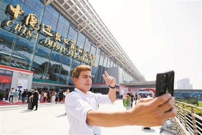廣交會(huì)首日,一位來自南美洲的外商在展館外自拍