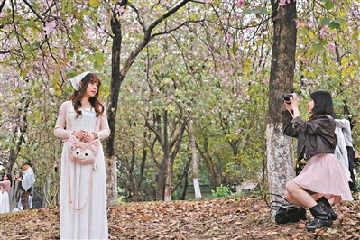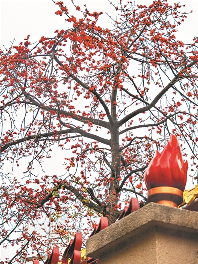 海珠國家濕地公園里,宮粉紫荊與櫻花相繼綻放,粉白花海在水岸之間延伸;華南農業(yè)大學紫荊大道上,花枝如云,微風拂過,花瓣輕輕飄落,鋪成一條淡紫色的花路;中山紀念堂前,古木棉年年如約盛開,紅花高舉,與古建筑相映生輝。流花湖畔、二沙島邊、閱江路沿線,三角梅、紫荊、木棉次第開放,讓整座城市仿佛生長在花海之中。