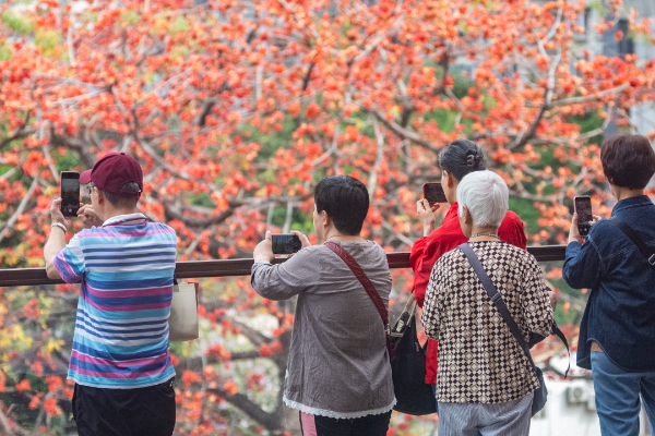 在毛澤東同志主辦農(nóng)民運(yùn)動(dòng)講習(xí)所舊址紀(jì)念館,木棉花正迎風(fēng)怒放,火紅花朵與青磚灰瓦、古樸屋脊交相輝映,盡顯嶺南古韻,吸引不少市民、游客用鏡頭定格繁花與古建相融的美景。