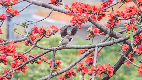 春日時(shí)節(jié),廣州中山紀(jì)念堂內(nèi)的29株木棉樹(shù)陸續(xù)進(jìn)入觀賞期,藍(lán)瓦、黃墻、紅棉、暖陽(yáng)……古建筑與木棉花交相輝映的畫(huà)卷徐徐鋪展。
