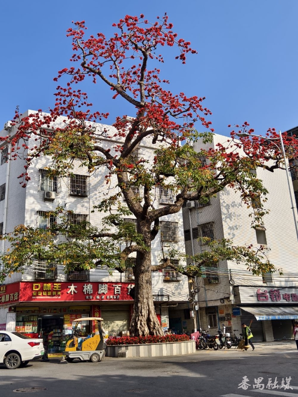 番禺傍江西村這株木棉花開(kāi)艷麗。