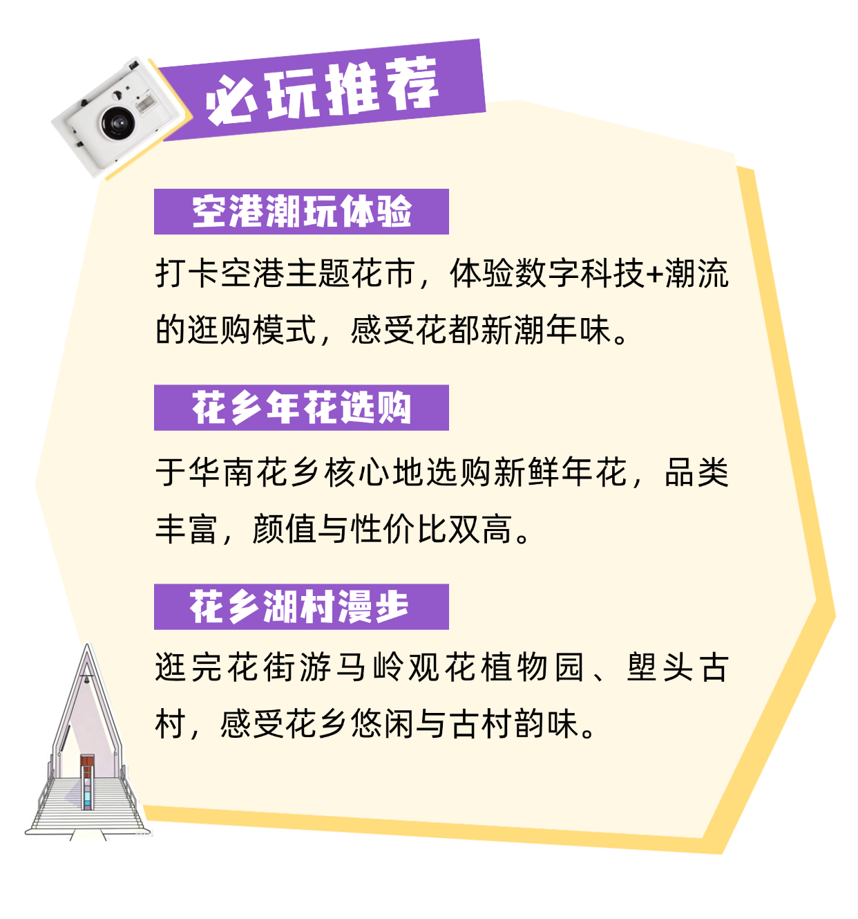 ?? 花市亮點:空港+花市,潮玩無界。以“空港”為主題,融合潮流元素與數(shù)字科技,打造沉浸式潮購場景,作為華南花鄉(xiāng)的核心陣地,年花品類豐富,顏值與性價比雙高,夠潮夠好逛!