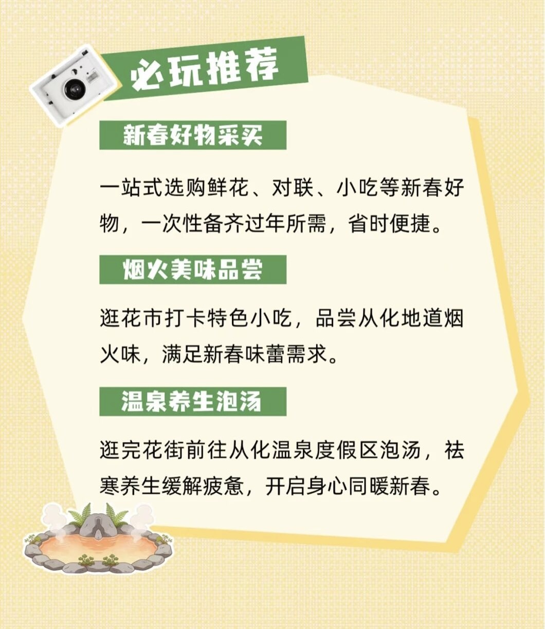 ?? 花市亮點:山間花市,溫泉暖意。一站式新年大超市,鮮花、對聯(lián)、小吃應(yīng)有盡有,煙火氣十足,承包新春采購與味蕾滿足。