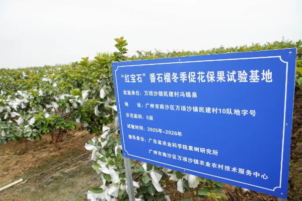 為將萬頃沙番石榴打造成萬頃沙的“金字招牌”,寫實(shí)萬頃沙鎮(zhèn)“土特產(chǎn)”文章,萬頃沙鎮(zhèn)于2024年推出“紅寶石”番石榴種植大禮包。同年5月,萬頃沙鎮(zhèn)民建村番石榴種植戶馮錦泉認(rèn)領(lǐng)“紅寶石”番石榴種植大禮包,并種植約3333平方米“紅寶石”番石榴,樹體長(zhǎng)勢(shì)旺盛,開花量大,但因幼果期持續(xù)落果,最終沒有產(chǎn)量。2025年,該地塊被列為“紅寶石”番石榴?;ū9夹g(shù)攻關(guān)試驗(yàn)點(diǎn),萬頃沙番石榴博士工作站團(tuán)隊(duì)系統(tǒng)集成與應(yīng)用了花果調(diào)控、營(yíng)養(yǎng)管理、病蟲害綠色防控等配套技術(shù),以提升冬季果的坐果率和果實(shí)整齊度。