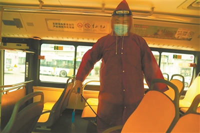 461路線線長鄧耀輝對車輛進(jìn)行消毒。