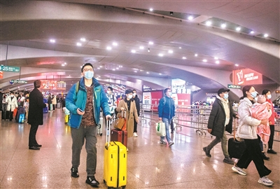 2月9日,在廣州南站,搭乘高鐵返程的旅客正在出站
