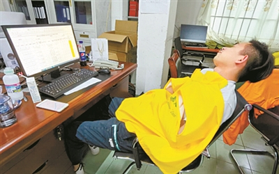 由于每天下發(fā)的數(shù)據(jù)全天候不定時,辦公室已然成為他們臨時的“家”。累了,就在走廊里活動下筋骨;乏了,就喝杯茶提提神;困了,就在座位上瞇一會。來不及吃飯已是常態(tài),和戰(zhàn)友們并肩作戰(zhàn)的日日夜夜,或許成為他們記憶里難忘的一段時光。