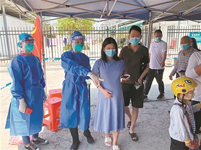 在核酸檢測(cè)現(xiàn)場(chǎng),很多檢測(cè)點(diǎn)為老人、兒童、孕婦、殘疾人等特殊群體開(kāi)通暖心“綠色通道”,優(yōu)先安排采樣,同時(shí)居民主動(dòng)為孕婦、小孩“讓位”的場(chǎng)景也時(shí)有發(fā)生?!罢?qǐng)有序排隊(duì)檢驗(yàn)!”在“大聲公”的喊聲中,市民們有序排隊(duì)進(jìn)行檢測(cè)。4月9日12時(shí)30分許,一位身懷六甲的女士在其愛(ài)人的引帶下,來(lái)到黃埔區(qū)魚(yú)珠益庭閣核酸檢測(cè)點(diǎn),工作人員立即迎上前去,攙扶她辦理相關(guān)手續(xù),通過(guò)綠色通道,完成咽拭子釆樣工作。
