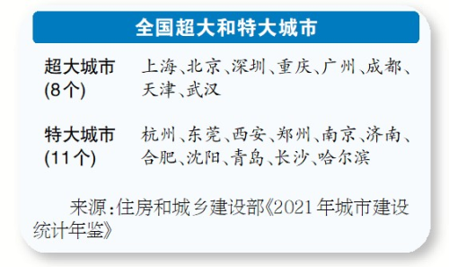 根據(jù)國務(wù)院于2014年下發(fā)的《關(guān)于調(diào)整城市規(guī)模劃分標準的通知》,城區(qū)常住人口1000萬以上的城市為超大城市,城區(qū)常住人口500萬以上1000萬以下的城市為特大城市。根據(jù)住房和城鄉(xiāng)建設(shè)部公布的《2021年城市建設(shè)統(tǒng)計年鑒》,截至2021年末,全國共有超大城市8個,分別為上海、北京、深圳、重慶、廣州、成都、天津、武漢。全國特大城市11個,分別為杭州、東莞、西安、鄭州、南京、濟南、合肥、沈陽、青島、長沙、哈爾濱。