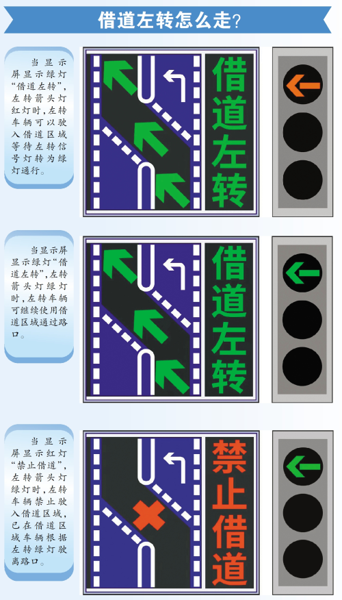 駕駛員使用借道區(qū)域左轉(zhuǎn)時,必須嚴格按照顯示屏來決定是否駛?cè)搿敖璧绤^(qū)域”。過往車輛當(dāng)遇到借道左轉(zhuǎn)車道內(nèi)存在未清空的車輛時,應(yīng)注意避讓。