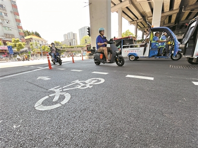 7月25日上午,記者在現(xiàn)場看到,中山八環(huán)島處,大部分電動自行車騎行者在新劃設(shè)的非機(jī)動車等待區(qū),根據(jù)非機(jī)動車信號燈的指示通行。新設(shè)置的7處非機(jī)動車等待區(qū)中,有一處還根據(jù)通行方向,比如“黃沙大道”“雙橋路”等,進(jìn)一步細(xì)化了路面標(biāo)志。