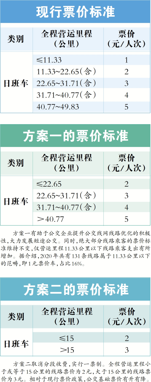 兩個方案都提出取消現(xiàn)行的一元票價。根據(jù)方案一,將恢復(fù)日班車線路起步價格為2元;對于全程5元票價線路,取消全程營運(yùn)里程49.83公里的上限限制。根據(jù)方案二,全程營運(yùn)里程小于或等于15公里的線路票價為2元,大于15公里的線路票價為3元。