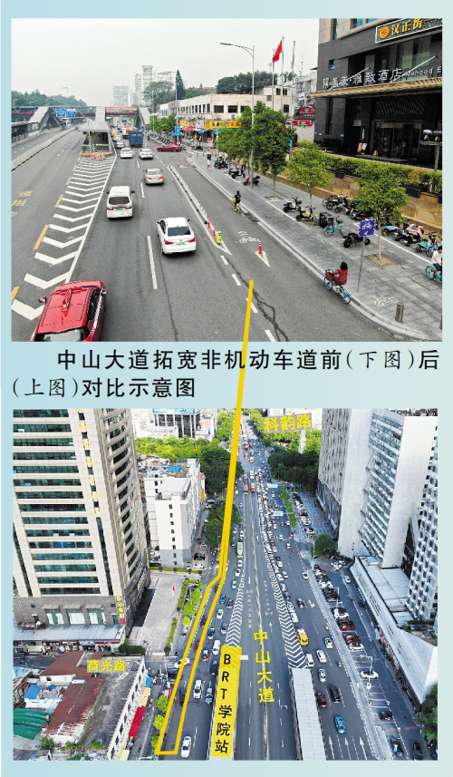 經(jīng)充分研究,相關(guān)部門對(duì)中山大道進(jìn)行了優(yōu)化改造,通過(guò)壓縮機(jī)動(dòng)車道寬度,并將最右側(cè)機(jī)動(dòng)車道改為非機(jī)動(dòng)車通道,設(shè)置機(jī)非分隔護(hù)欄和示警樁;優(yōu)化荷光路口、上社橫街路口等路口的非機(jī)動(dòng)車通道,配套設(shè)置非機(jī)動(dòng)車指引標(biāo)志,保持非機(jī)動(dòng)車通道的連貫性;精細(xì)化調(diào)控路口的信號(hào)配時(shí)方案,保障交叉口各時(shí)段各方向車流平衡,保障交通安全有序。