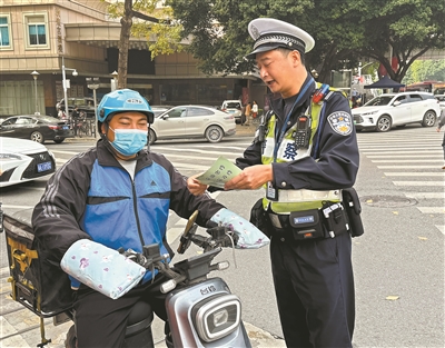 東風(fēng)路陵園西路路口,電動自行車駕駛?cè)吮粓?zhí)勤交警攔下接受宣傳勸導(dǎo)