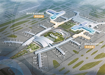 東四西四指廊將T1、T2兩座航站樓連接起來。
