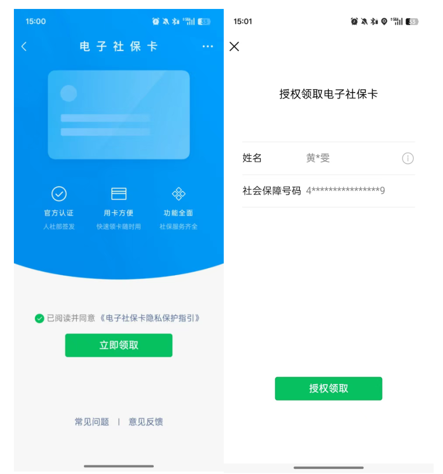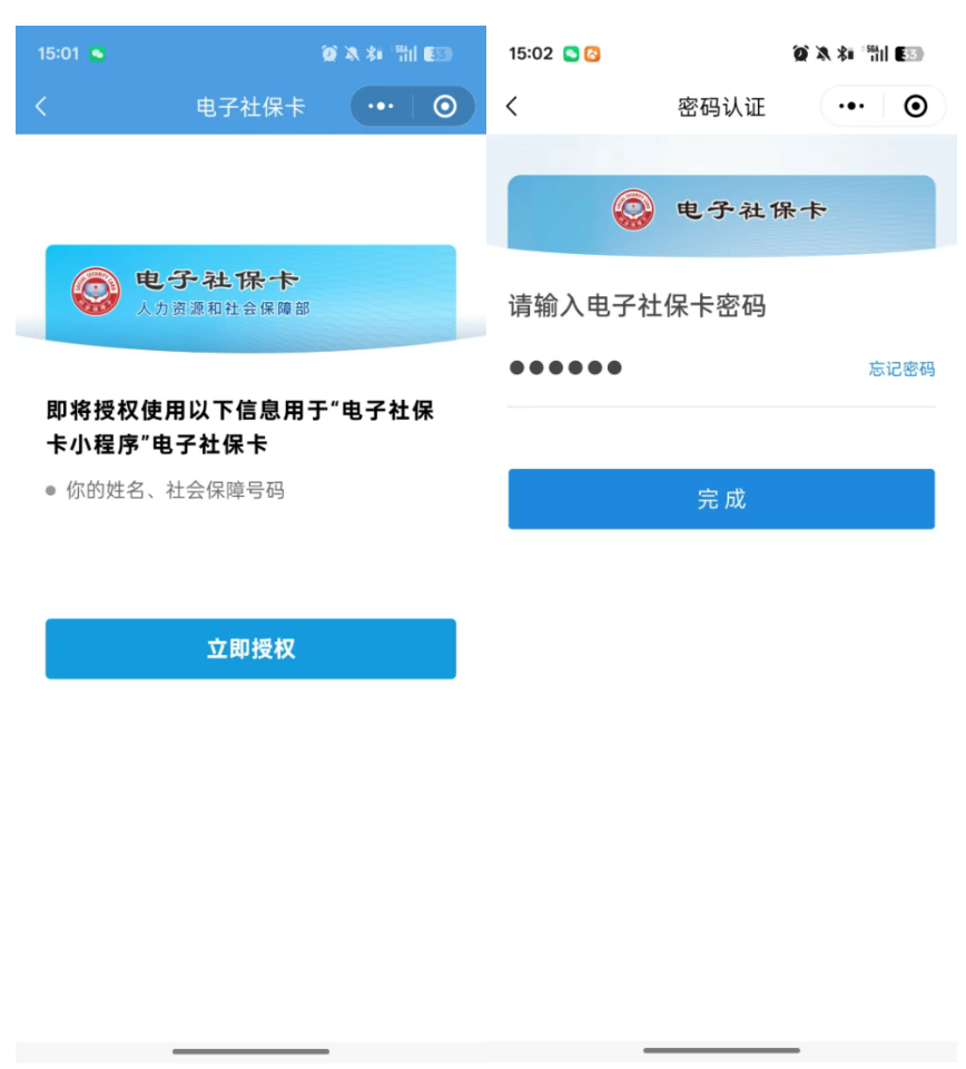 2.首次申領(lǐng),可能會存在登錄、申領(lǐng)、授權(quán)、設(shè)置密碼等環(huán)節(jié),按頁面提示操作即可,成功申領(lǐng)后,再次調(diào)用電子社??ǘS碼時(shí),僅需輸入密碼,即可調(diào)用。