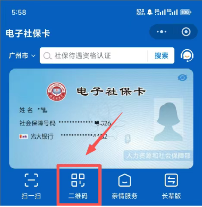 第一步:通過電子社??ˋPP、微信小程序和支付寶小程序進(jìn)入電子社??撁?,點(diǎn)擊二維碼標(biāo)識,市民出示本人電子社保卡二維碼;