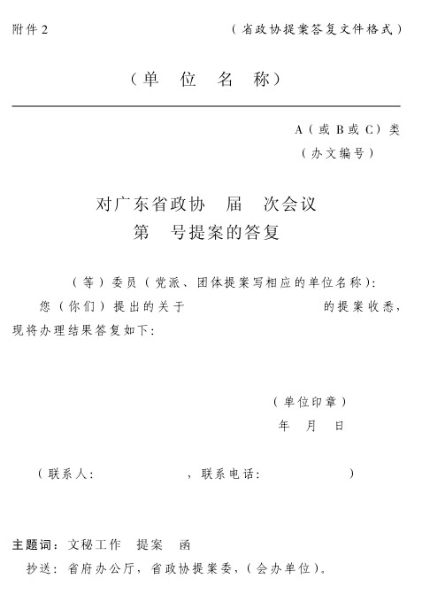(五)市政協(xié)提案,由主辦單位綜合會(huì)辦單位意見(jiàn)后,將答復(fù)文件直接寄送提出提案的委員各1份(民主黨派、人民團(tuán)體和政協(xié)專門委員會(huì)提案寄送3份),同時(shí)抄送市府辦公廳1份、市政協(xié)提案委員會(huì)3份、會(huì)辦單位各l份。