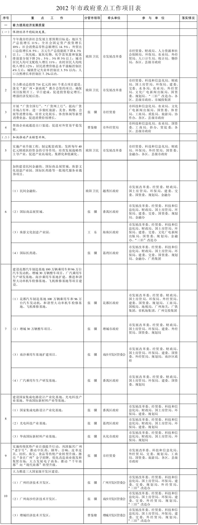 根據(jù)市政府領導的最新分工,市政府決定對2012年市政府重點工作的分管市領導作部分調整?,F(xiàn)將調整后的《2012年市政府重點工作項目表》印發(fā)給你們。請各單位按照《印發(fā)2012年市政府重點工作責任分工的通知》(穗府〔2012〕4號)的工作要求,繼續(xù)加快推進各項重點工作的貫徹落實,并主動向分管市領導匯報工作進展情況。工作中遇到疑難問題要及時報請分管市領導協(xié)調解決,確保按時保質完成各項工作任務。