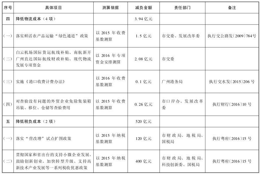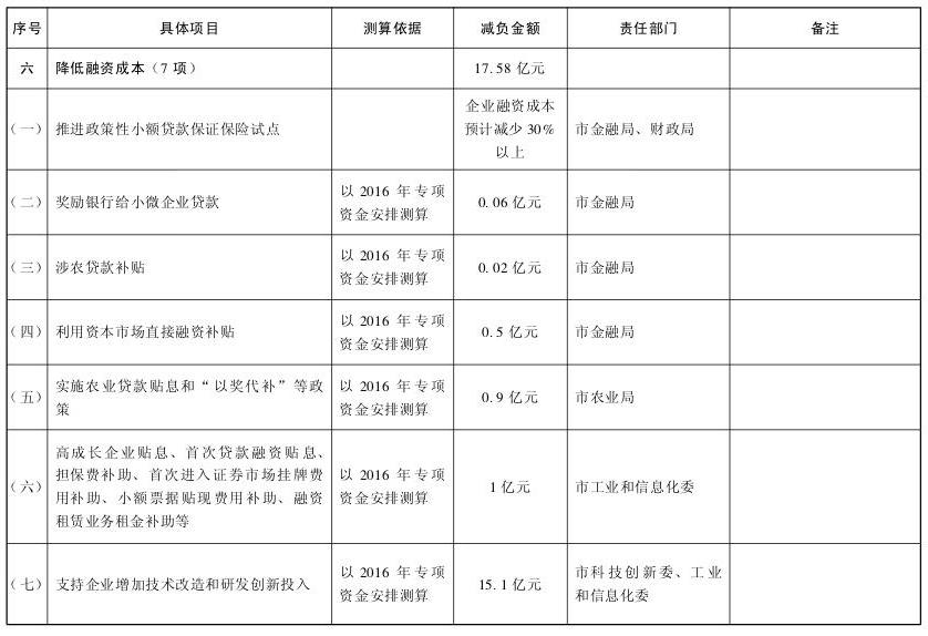 (四)降成本方面。降低實體經(jīng)濟運行成本,切實保持競爭優(yōu)勢。到2016年底,為全市企業(yè)減負約705億元,其中實施普遍性降費(含政府性收費、基金)約63億元、人工成本約95億元、生產(chǎn)要素成本約5億元、物流成本約4億元、稅負成本約520億元、融資成本約18億元,企業(yè)綜合成本比2014年下降5%—8%。到2018年底,企業(yè)負擔持續(xù)減輕,企業(yè)競爭力明顯提升。