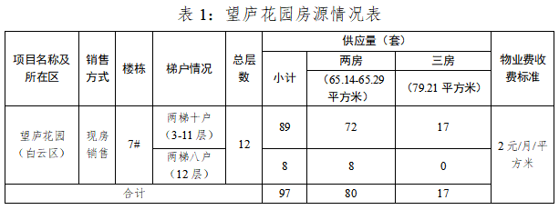 望廬花園配售型保障性住房項(xiàng)目位于廣州市白云區(qū)廣云路216號(hào),近地鐵2號(hào)線江夏站、黃邊站,由廣州安居集團(tuán)所屬?gòu)V州安居投資發(fā)展有限公司(下稱安居投資公司)進(jìn)行銷售,本次推出的樓棟為7#,供應(yīng)房源97套,房屋戶型、套數(shù)等情況詳見(jiàn)下表: